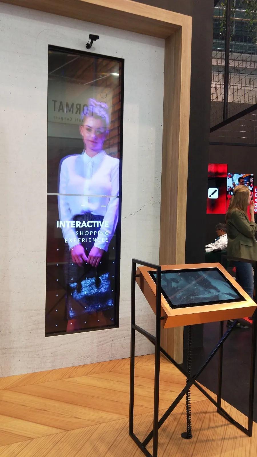在它的旁邊是一款智能貨架,兩個層板上的產(chǎn)品均可以顯示價格,同時當(dāng)產(chǎn)品位置發(fā)生變換的時候,價格也跟著調(diào)整。背面是一整塊大屏幕,閑時播放產(chǎn)品廣告遠(yuǎn)距離傳播,當(dāng)有產(chǎn)品被拿取的時候大屏幕會以畫中畫的形式展示所拿取商品的信息。